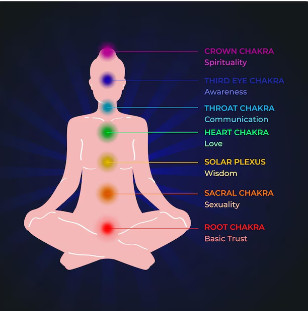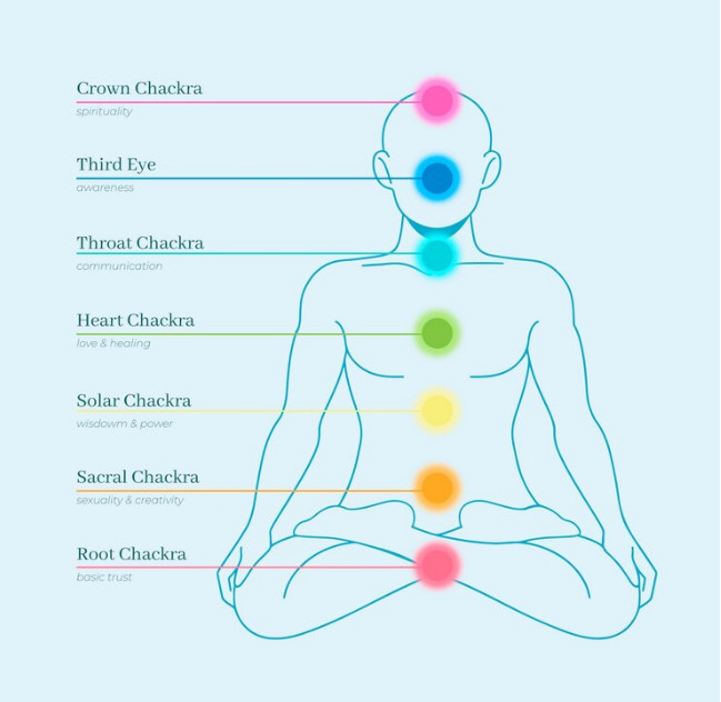 인체에는 일곱 개의 주요 차크라가 있으며, 각각의 차크라는 특정한 신체 부위와 관련이 있습니다. 아래는 일곱 개의 주요 차크라와 그 역할에 대한 설명입니다.